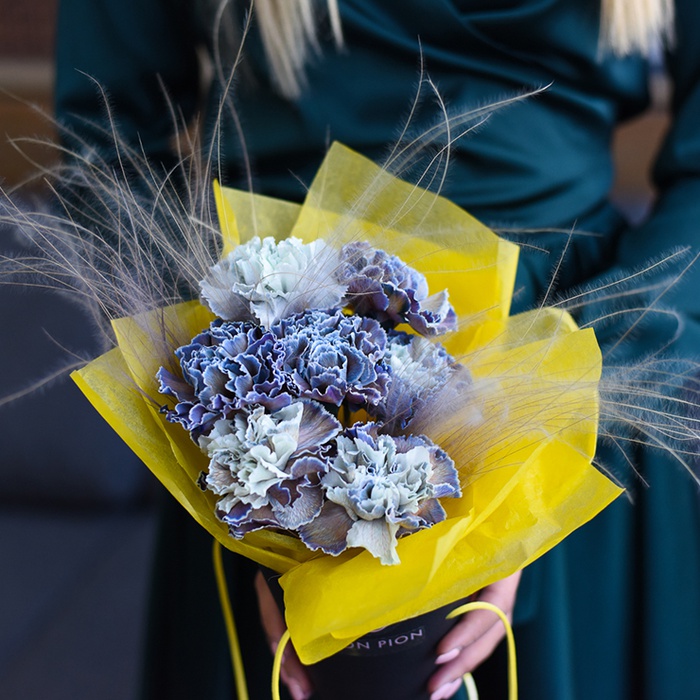 Букет-сумочка з магічних гвоздик і пухнастою стіфою - оригінальна пропозиція в фірмової упаковці від Don Pion