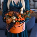 Коробка з квітами - це цікава альтернатива звичайному букету. Осінні відтінки і екзотичні квіти підійдуть як привітання на День народження, так сюрприз на Halloween вечірку.