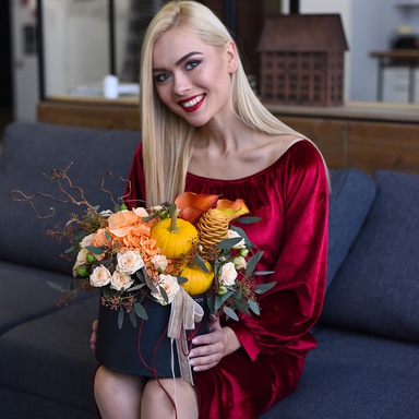 Квіти в коробці "Осіння пора" — це витончена гармонія відтінків золотої осені, втілена у стильній композиції. Теплі кольори, ніжні текстури та неповторна атмосфера цієї пори року зібрані у витонченому дизайнерському рішенні. Такий подарунок стане особливим символом турботи, ніжності та вдячності, адже він здатний не лише прикрасити будь-який простір, а й подарувати щирі емоції. Осінні барви квітів у поєднанні з елегантною коробкою створюють відчуття затишку й свята, роблячи цю композицію ідеальною для будь-якої нагоди.