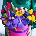 Неймовірно яскрава коробка з весняних квітів. Квіти в шляпной коробці цікава альтернатива звичайному букету. Підійде як подарунок найближчим, так і привітання колег і бізнес партнерів.