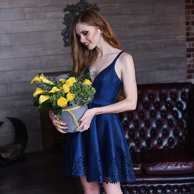 Калла жовта, гортензія біколор, троянда Пенні Лейн, акація, аралія, коробка.