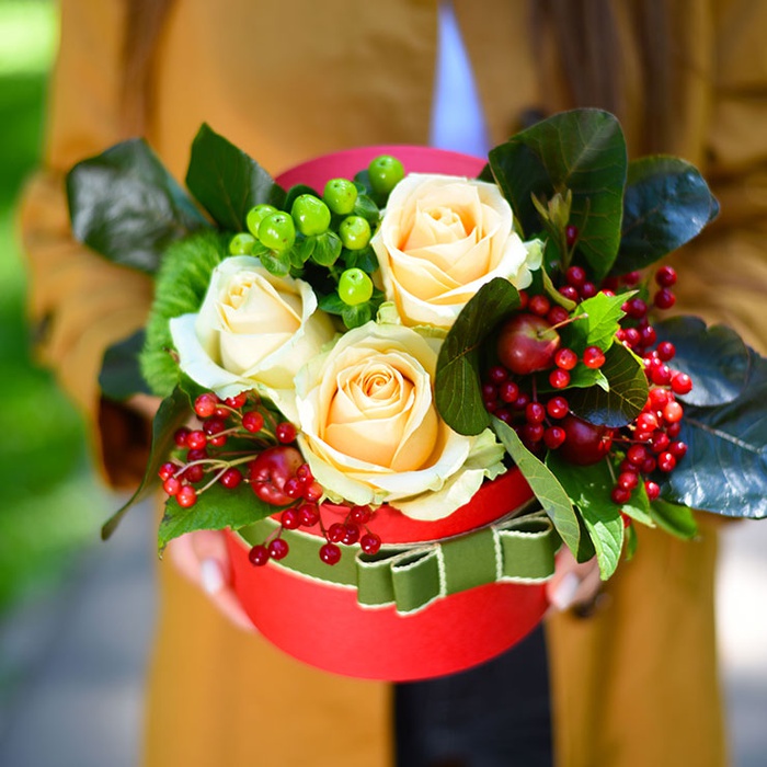 Осіння капелюшна коробка з ніжними трояндам і стиглими ягодами - цікава альтернатива звичному букету.