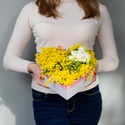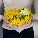 Мімоза і фрезія в капелюшній коробці у вигляді серця виглядають стильно, ніжно і по-весняному чудово.