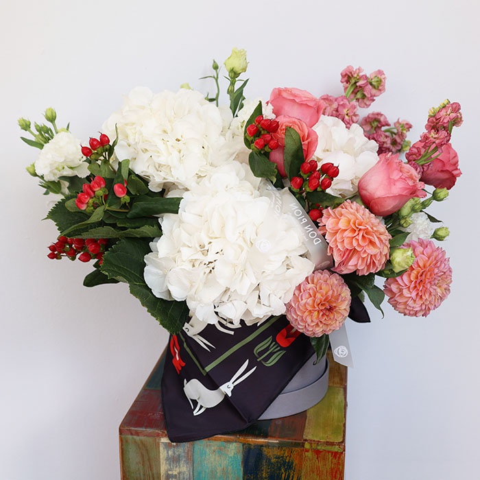 Коробка, хустка на вибір - 1 шт., гортензія - 3 шт, матіола - 3 шт, еустома - 3 шт, троянда "Пінк Експрешен" - 5 шт, жоржина - 4 шт, хіперикум - 4 шт