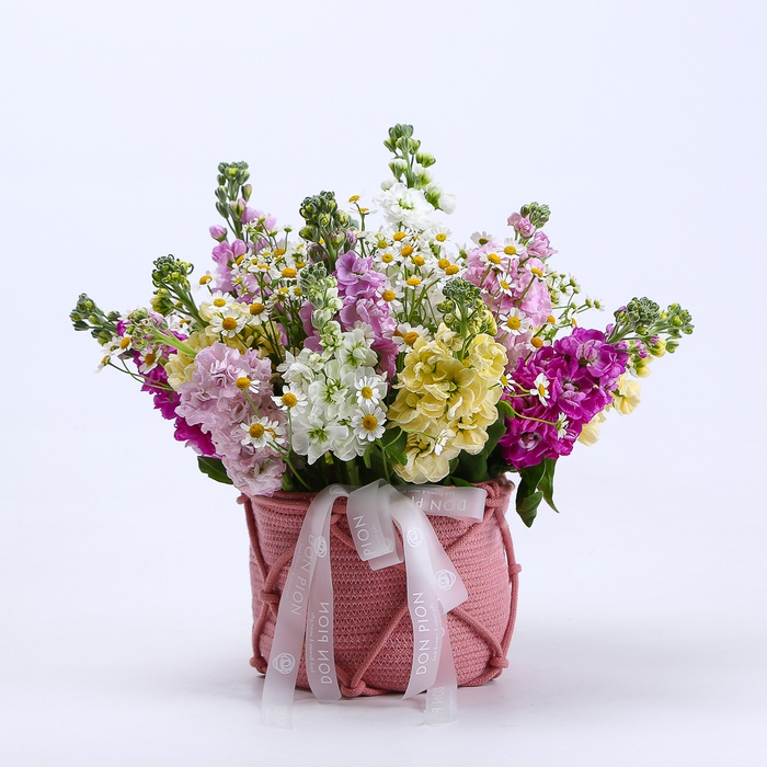 Кошик, матіола мікс - 15 шт, ромашка - 5 шт