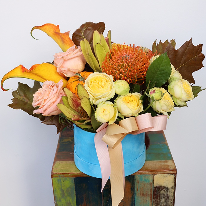 Коробка оксамитова, леукоспермум - 2 шт, целозія - 1 шт, леукадендрон - 2 шт, троянда "Шіммер" - 2 шт, троянда кущова "Піоні Бабблз" - 2 шт, куеркус - 2 шт, калла - 3 шт, гарбуз - 1 шт.