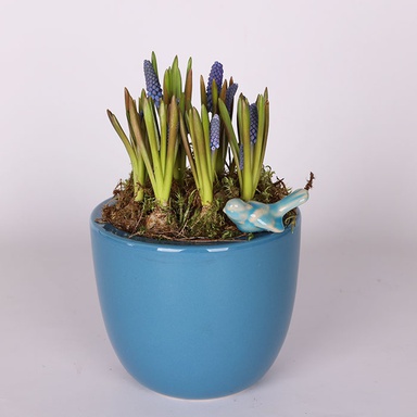 Відчуйте подих весни разом із мускариками у керамічному горщику. Ці чарівні блакитні квіти символізують пробудження природи та дарують атмосферу легкості й свіжості. Стильний керамічний горщик гармонійно доповнює композицію, додаючи витонченості та елегантності.