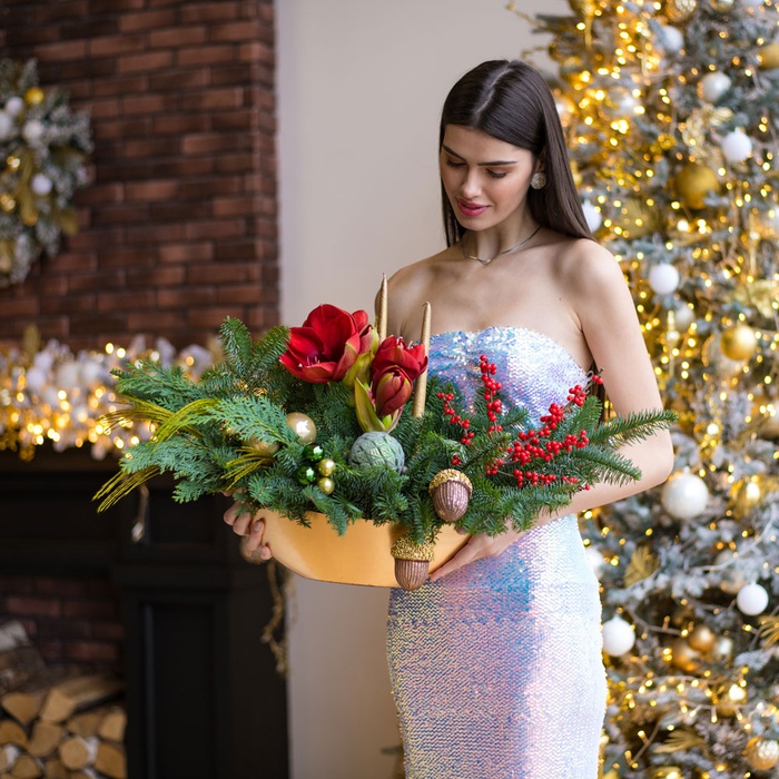 Новорічна композиція "Квітка Різдва" від DonPion — це втілення святкової чарівності та елегантності, яка прикрасить ваш дім або стане вишуканим подарунком для близьких. Ця композиція поєднує ніжність амариліса, свіжість хвої та яскравість декоративних іграшок, створюючи гармонійний акцент на вашому святковому столі чи в інтер'єрі. Амариліс, символ краси та елегантності, додає особливого шарму, а свіжа хвоя наповнює приміщення приємним ароматом зими. Яскраві прикраси в композиції підкреслюють святкову атмосферу, додаючи нотки радості та тепла.