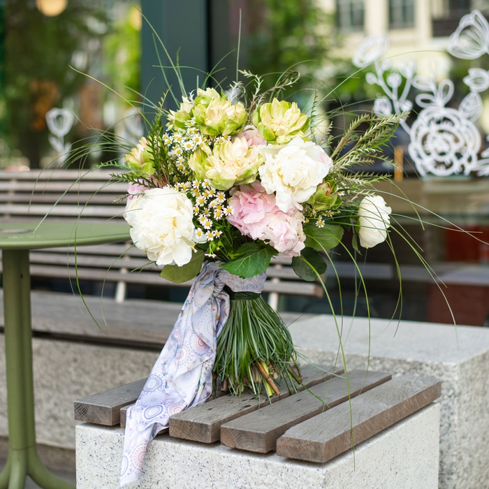 Троянда "Веггі" - 11 шт, танацетум - 6 шт, гревілія - 3 шт, берграс - 2 шт, аспідістра - 1 шт, півонія - 4 шт, гортензія - 3 шт, хустка Helissen 85*85 см
