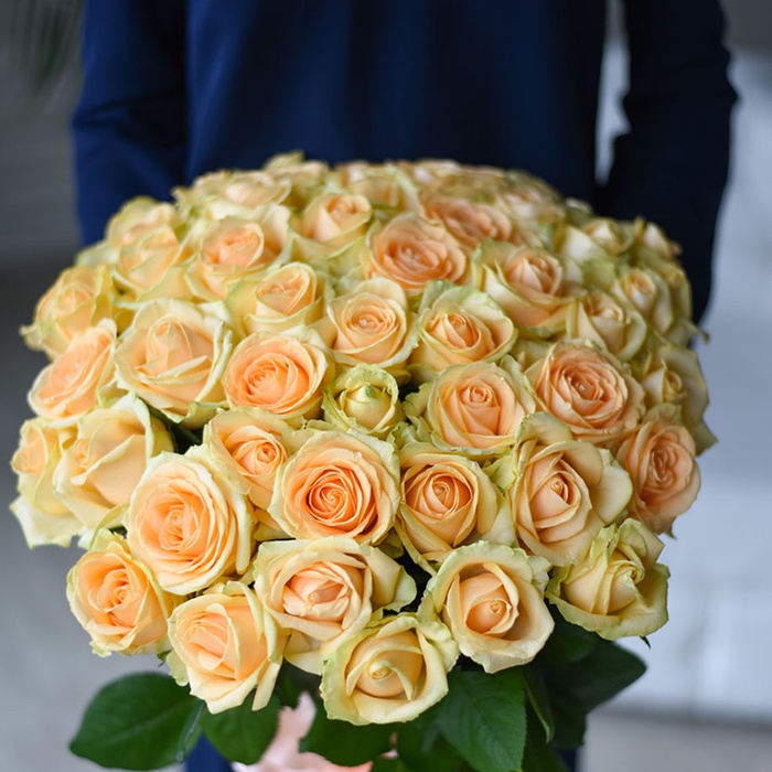 Величезний монобукет з персикової троянди виглядає ніжно і елегантно. Верхні пелюстки мають зеленуватий відтінок, але при повному розкритті бутона колір стає світло-персиковим. Чудово підходить як для особливих подій, так і для привітання на день народження.