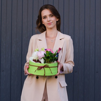 Коробка, еустома, черешня, кава в горщику, сертифікат на вино, півонія, троянда.