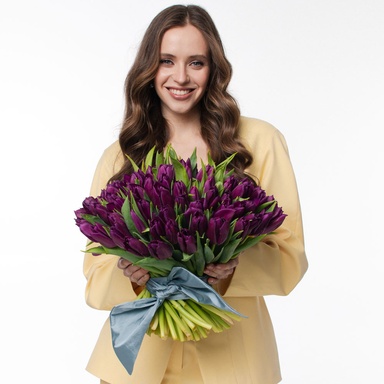 Букет «101 фіолетовий тюльпан» зачаровує з першого погляду. Насичений фіолетовий відтінок тюльпанів символізує глибокі почуття, повагу та захоплення, а велика кількість квітів підкреслює особливість моменту. Такий букет стане ідеальним подарунком для коханої людини, мами, подруги чи колеги, створюючи атмосферу свята та щирих емоцій.