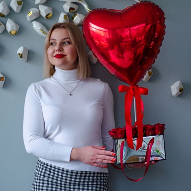 - Червоні троянди в сумочці з кулькою серце