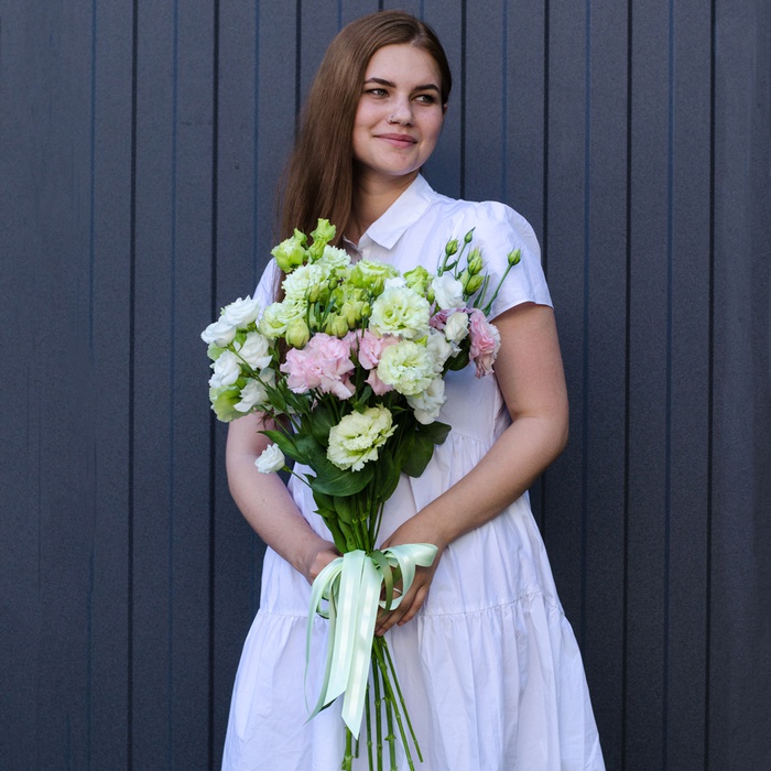 Ніжні і зворушливі квітки еустоми, що нагадують чуттєві бутони троянд на гілці. Вони здатні передати всю глибину теплого душевного відносини і щирих почуттів. Підійде як привітання близьких, так і колегам в День народження.