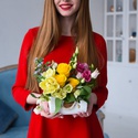 Весняна композиція в керамічному кашпо з пишних тюльпанів, яскравою троянди і еустоми, легких гілочок хелеборуса і оксіпеталума.
