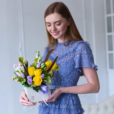 Флорист Don Pion збере композицію з цих яскравих тюльпанів, троянд, ранункулус помпон, еустоми, додасть пір'я фазана і вкладе в дерев'яний конверт точно також як на картинці.