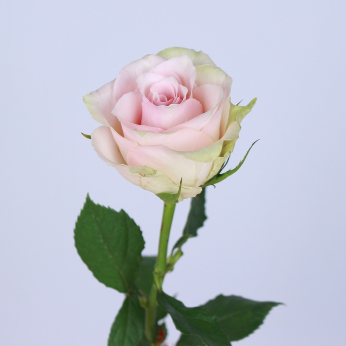 Витончена троянда з витягнутою формою бутона та довгастою ніжкою, підкорює своєю неймовірною красою. Гладкі махрові пелюстки пофарбовані в оригінальне ніжне поєднання – блідо-зеленого відтінку з ніжно-рожевим. Бутони виглядають витончено та розкриваються поступово.