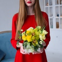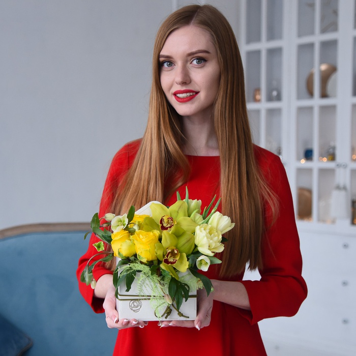 Ексклюзивна дерев'яна коробочка від Don Pion в жовтих відтінках: трояндою, Цимбідіум, тюльпанів і зеленню.