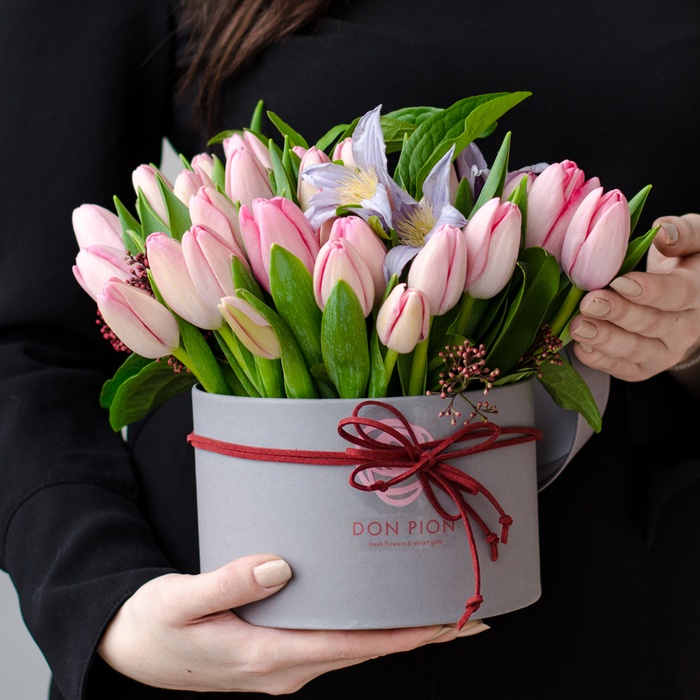 Коробка, тюльпан – 29 шт, клематис, скіммія.