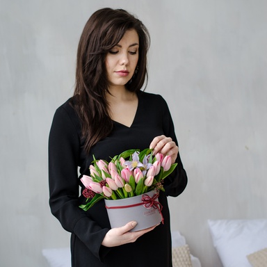 Коробка, тюльпан – 29 шт, клематис, скіммія.