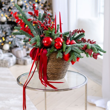 Кошик, хвоя, ілекс, евкаліпт, новорічний декор, свічки