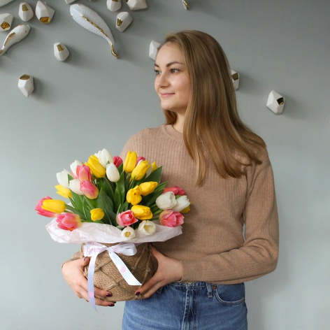 Букет тюльпанів пасує до безлічі подій: від ніжного ранкового компліменту до яскравого жесту на особливу дату. Їхня форма лаконічна, проте виразна. Кольорова палітра варіюється від сніжно-білих до насичено-бордових відтінків, що відкриває флористу широке поле для творчості.